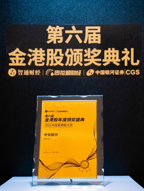 2022年1月11日,在深圳举办的“2022年全球投资趋势论坛暨第六届金港股颁奖典礼”上,中信股份(00267)荣获“2021年度金港股公司”大奖。