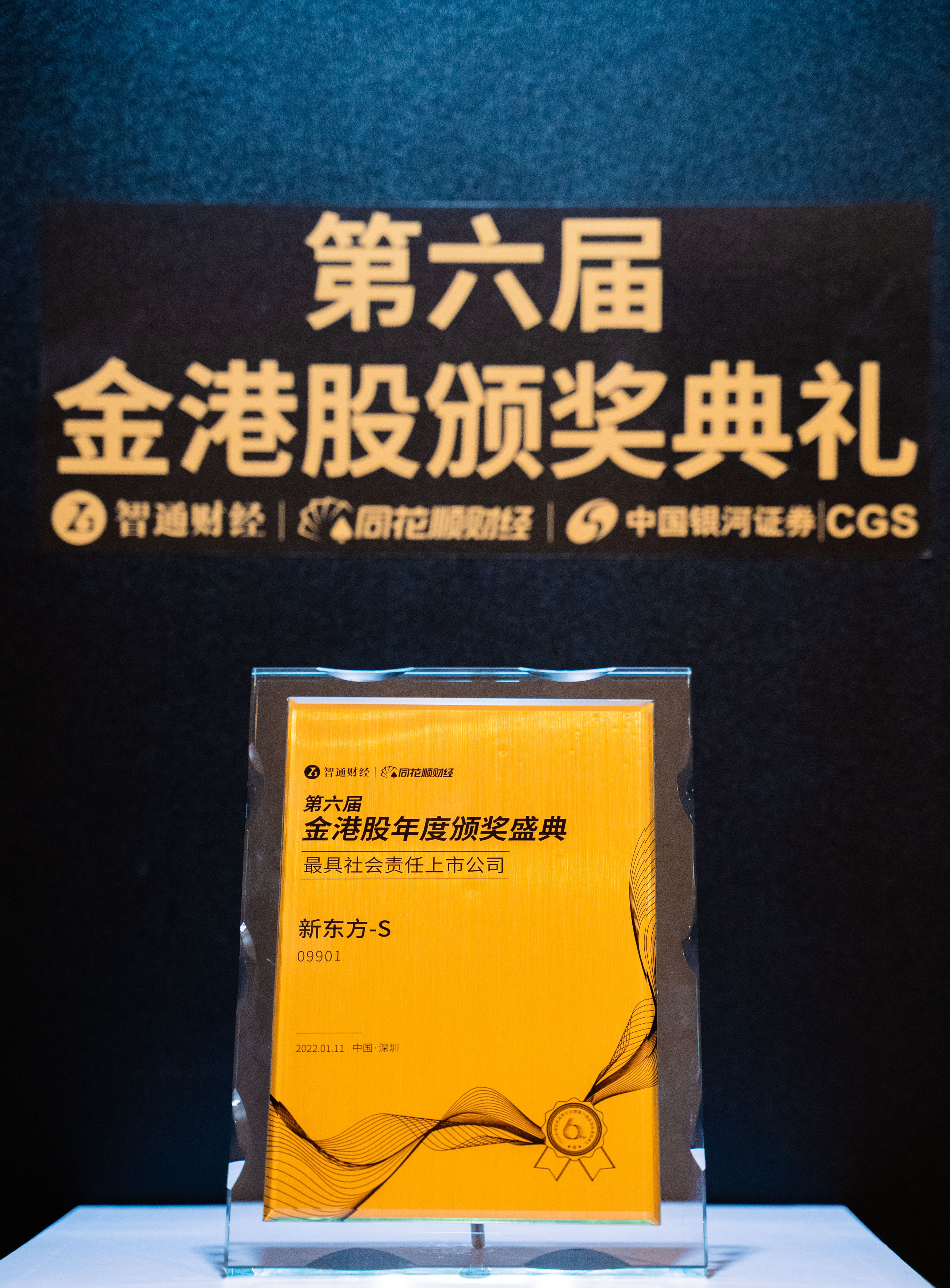 2022年1月11日,在深圳举办的“2022年全球投资趋势论坛暨第六届金港股颁奖典礼”上,新东方-S(09901)荣获“最具社会责任上市公司”大奖。