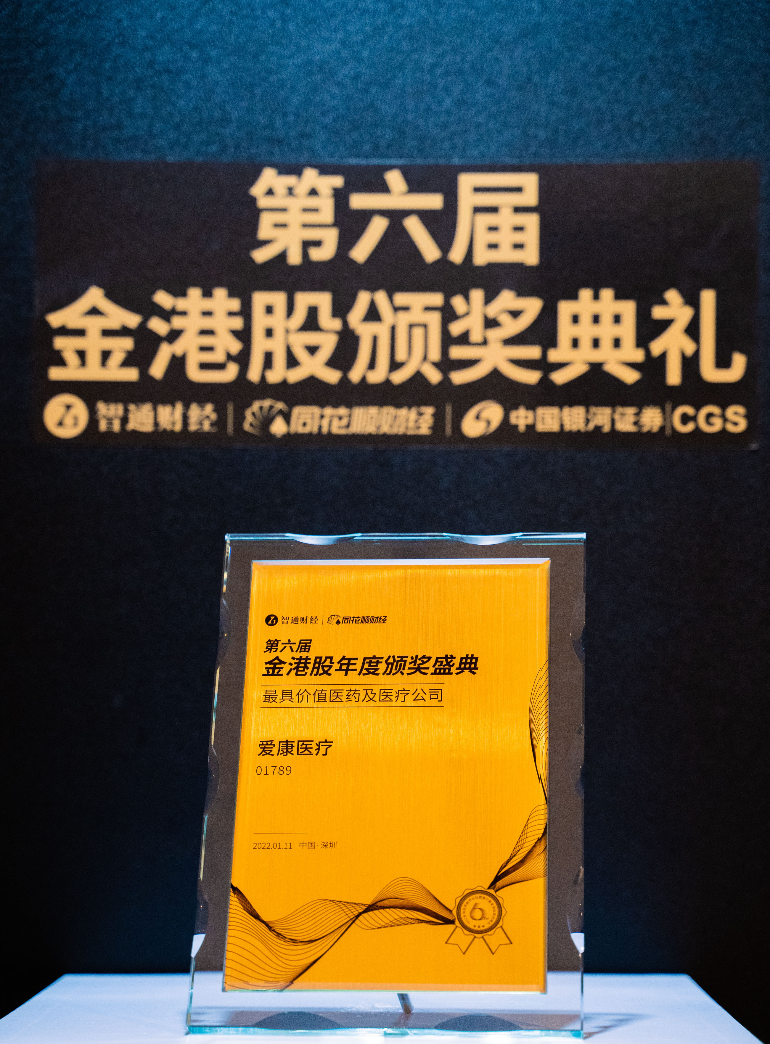 2022年1月11日,在深圳举办的“2022年全球投资趋势论坛暨第六届金港股颁奖典礼”上,爱康医疗(01789)荣获“最具价值医药及医疗公司”奖项。