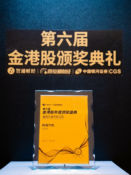 2022年1月11日,在深圳举办的“2022年全球投资趋势论坛暨第六届金港股颁奖典礼”上,和谐汽车(03836)荣获“最具价值汽车公司”、“最具社会责任上市公司”奖项。