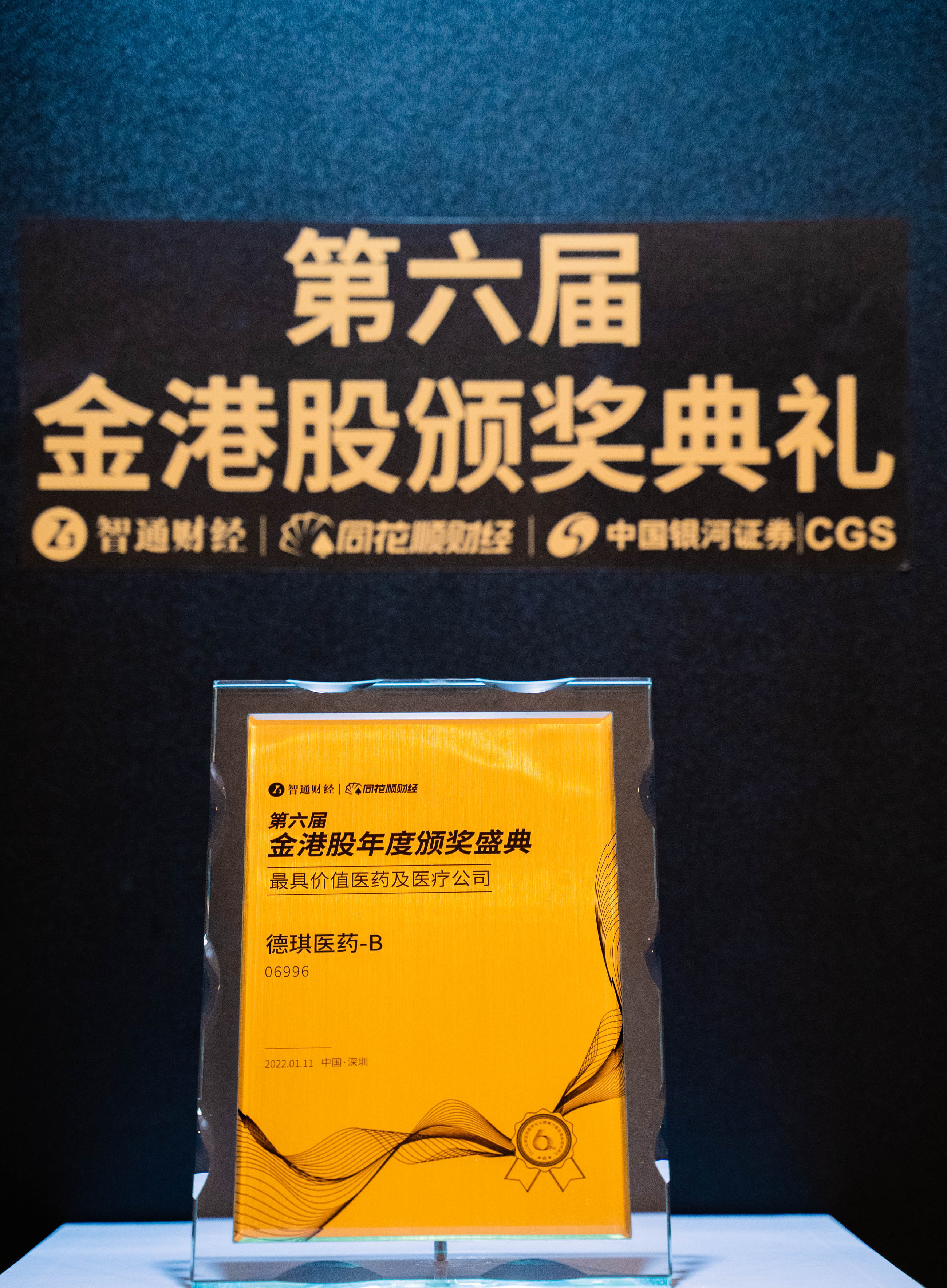 2022年1月11日,在深圳举办的“2022年全球投资趋势论坛暨第六届金港股颁奖典礼”上,德琪医药-B(06996)荣获“最具价值医药及医疗公司”奖项。