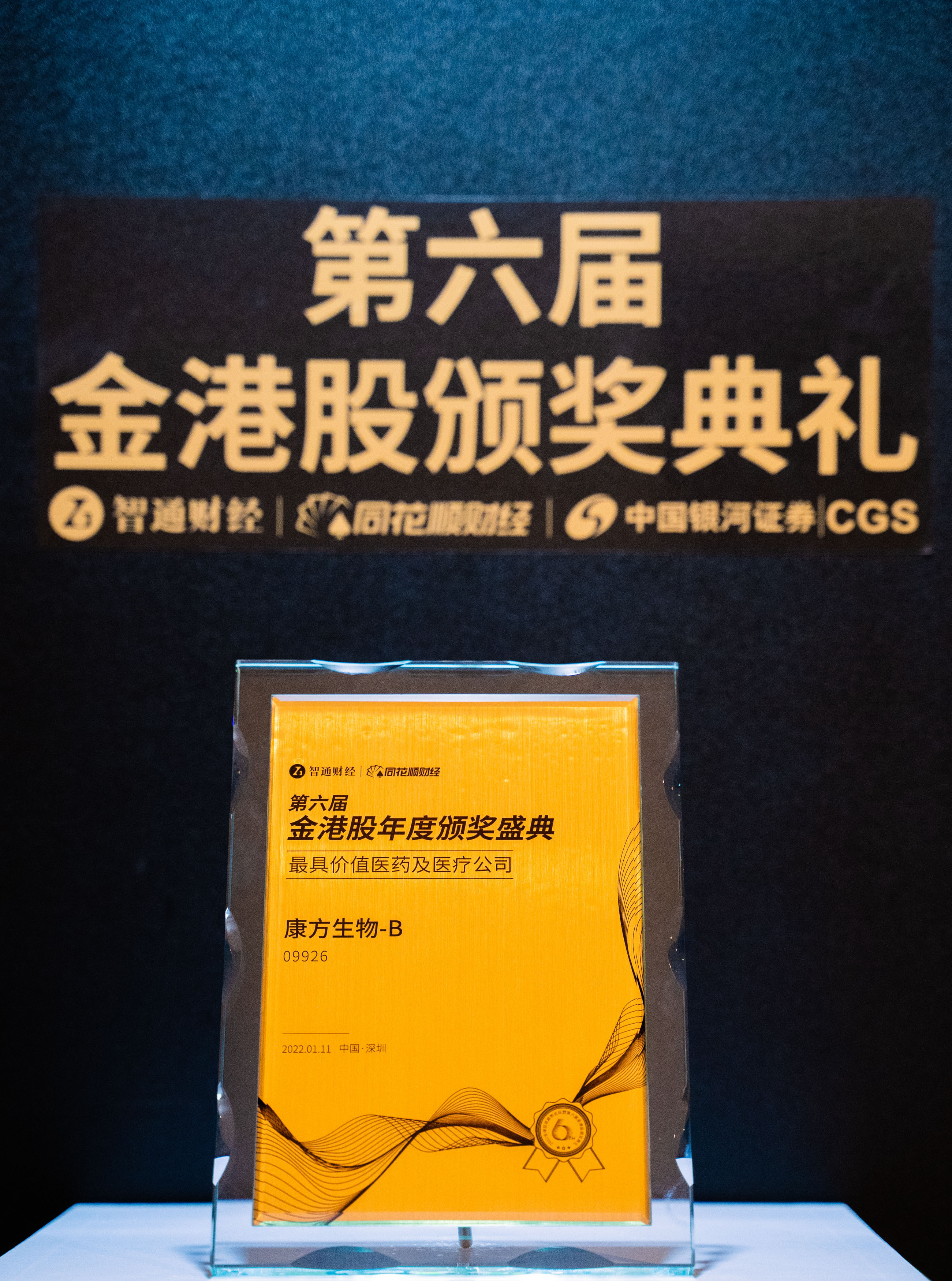 2022年1月11日,在深圳举办的“2022年全球投资趋势论坛暨第六届金港股颁奖典礼”上,康方生物-B(09926)荣获“最具价值医药及医疗公司”奖项。