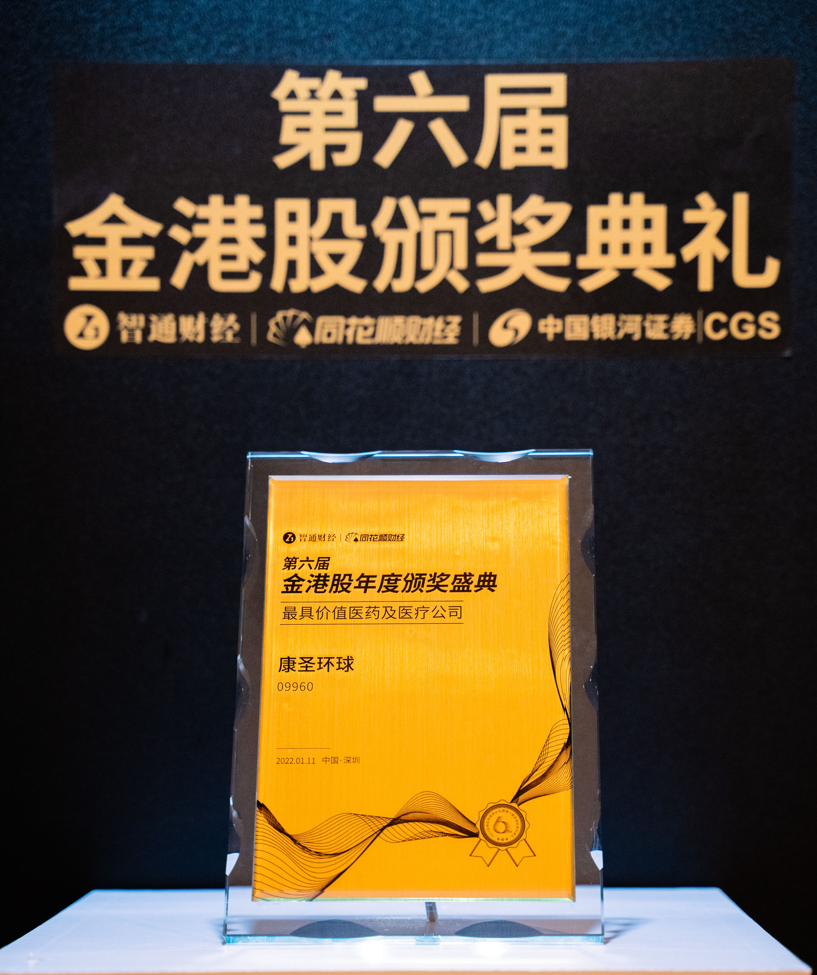 2022年1月11日,在深圳举办的“2022年全球投资趋势论坛暨第六届金港股颁奖典礼”上,康圣环球(09960)荣获“最具价值医药及医疗公司”奖项。