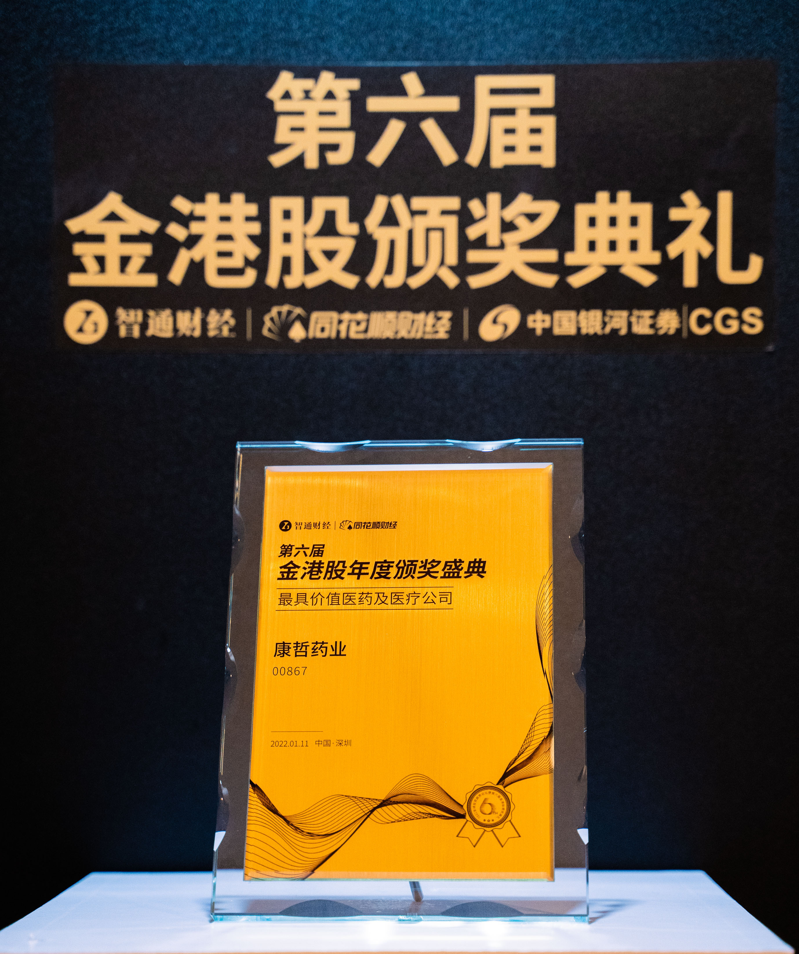 2022年1月11日,在深圳举办的“2022年全球投资趋势论坛暨第六届金港股颁奖典礼”上,康哲药业(00867)荣获“最具价值医药及医疗公司”奖项。