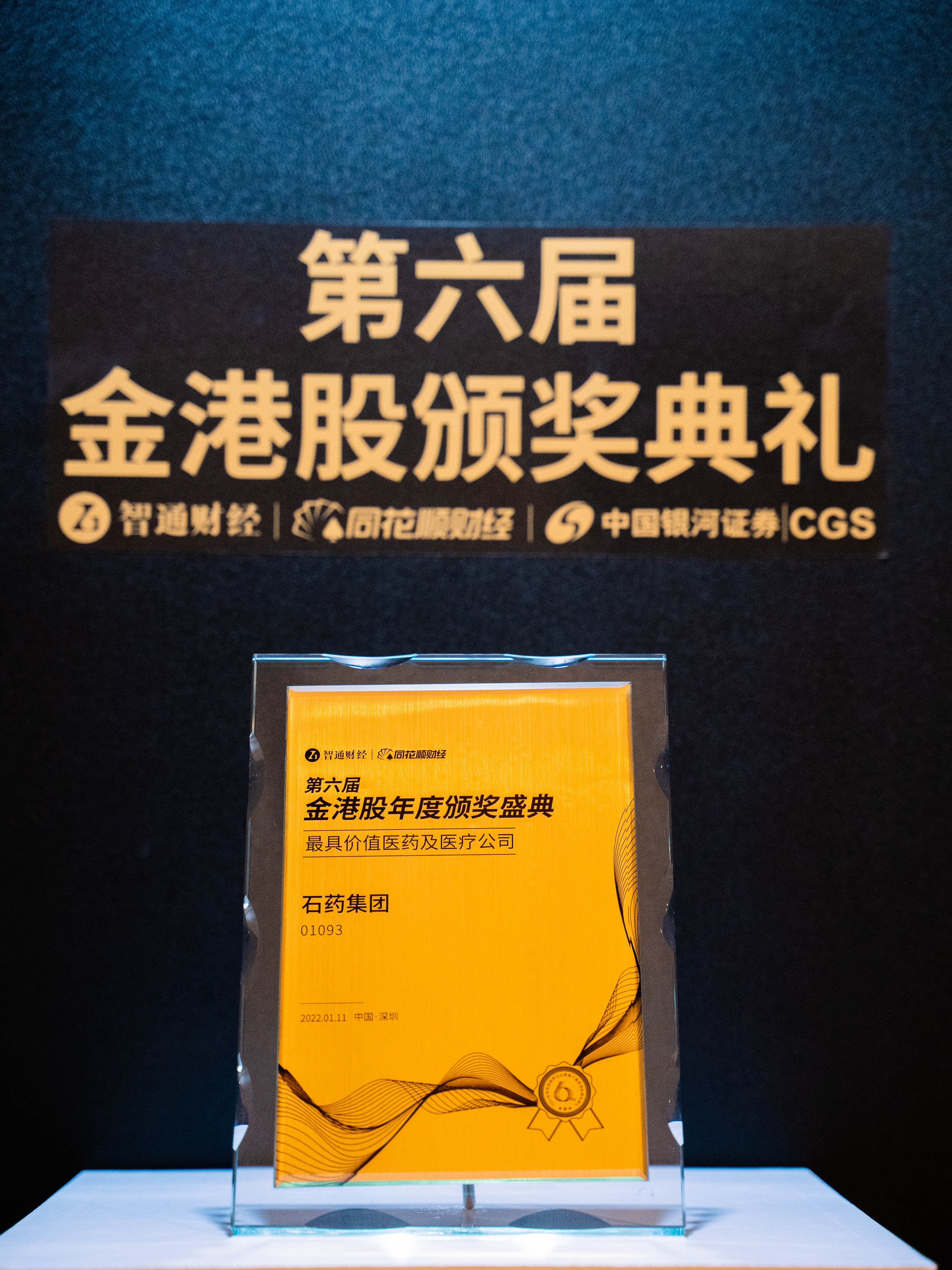2022年1月11日,在深圳举办的“2022年全球投资趋势论坛暨第六届金港股颁奖典礼”上,石药集团(01093)荣获“最具价值医药及医疗公司”奖项。