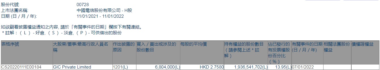 智通财经APP获悉,香港联交所最新资料显示,1月7日,GIC Private Limited减持中国电信(00728)680.4万股,每股作价2.758港元,总金额约为1876.54万港元。减持后最新持股数目约为19.37亿股,最新持股比例为13.95%。