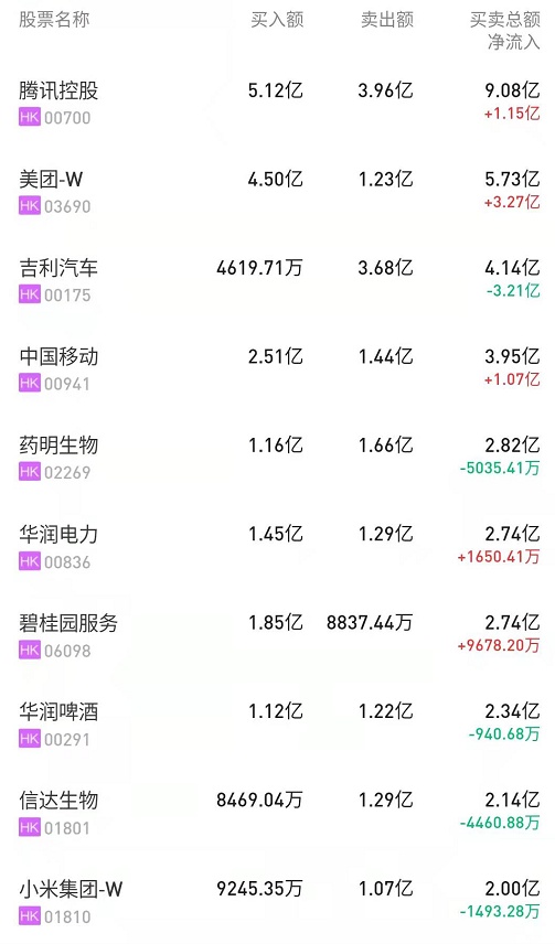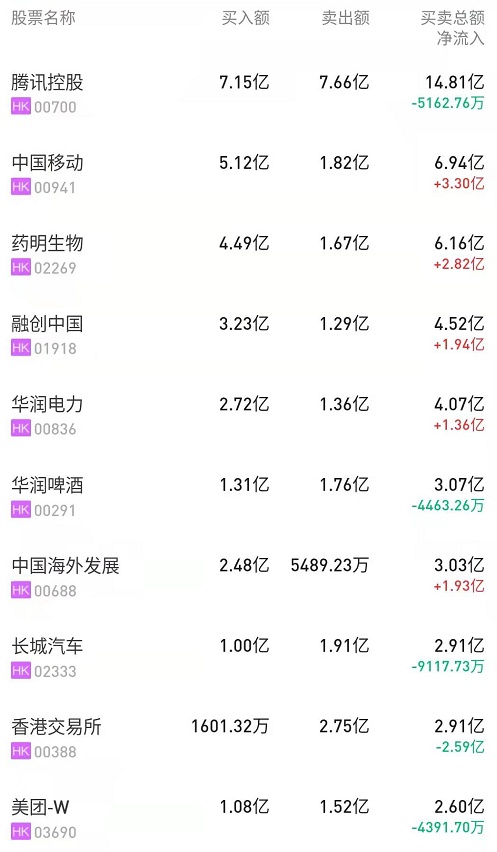中国移动(00941)获净买入4.37亿港元。消息面上,中国移动此前宣布,计划回购最多占已发行H股总数的10%。此外,天风证券表示,中国移动网络规模和用户规模领先优势明显。 C端业务受益提速降费转向精准降费,叠加5G渗透率快速提升、智慧家庭等增值服务持续发展,ARPU值企稳回升趋势确立,C端业务基本面全面向好。