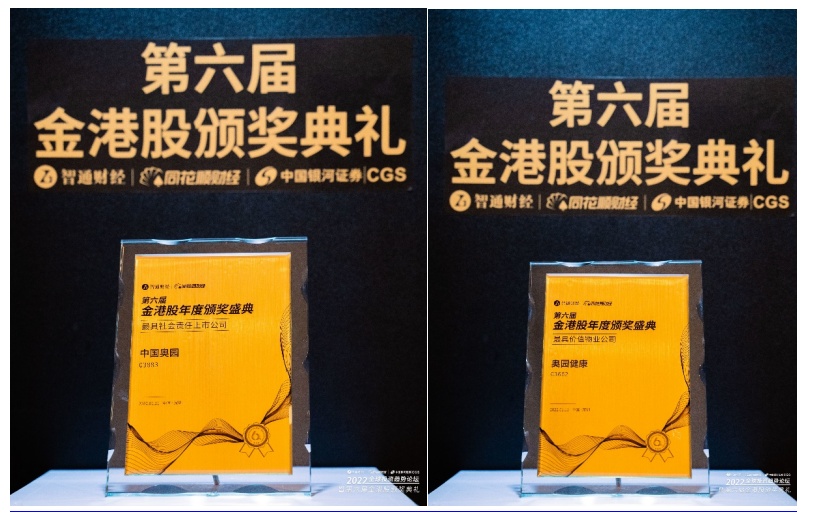 1月11日,在深圳举行的第六届“金港股”评选中,中国奥园(03883)获得“最具社会责任上市公司”奖项,体现了业界对于中国奥园积极践行社会责任的肯定。奥园健康(03662)获得“最具价值物业公司”奖项,凸显了市场对奥园健康发展前景和投资价值的认可。
