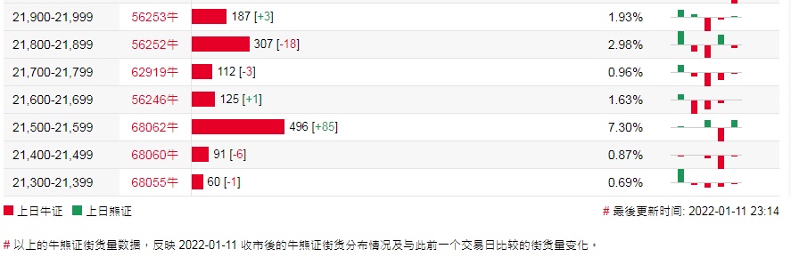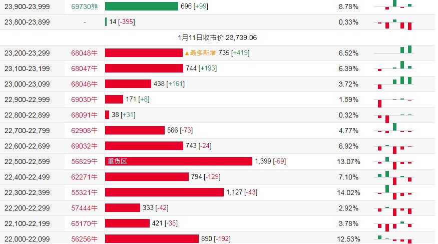 牛证街货重货区在22500-22599区间,该区间最新牛证数量为1399张,较上一交易日减少59张;最多新增在23200-23299区间,该区间最新牛证数量为735张,较上一交易日增加419张。
