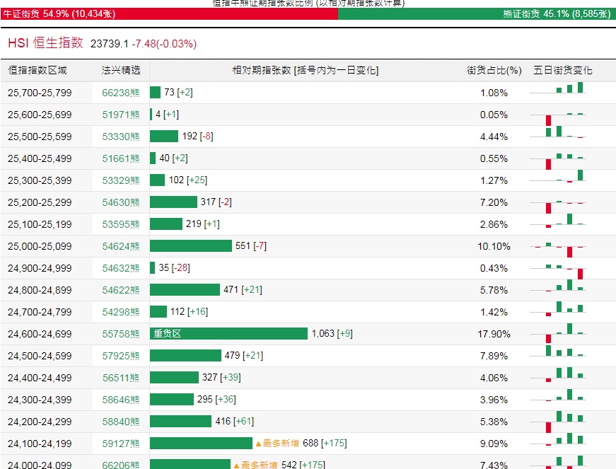 法兴恒指牛熊证街货分布图中的数据显示,熊证街货重货区在24600-24699区间,该区间最新熊证数量为1063张,较上一交易日增加9张;最多新增分别在24000-24099和24100-24199区间,区间最新熊证数量分别为542张和688张,较上一交易日同时增加175张。