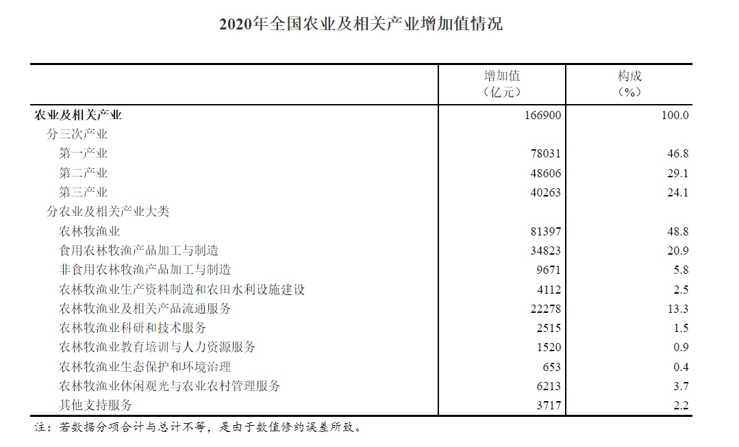 为全面准确反映农业生产、加工、物流、营销、服务等全产业链实现的价值,国家统计局根据《农业及相关产业统计分类(2020)》,依据相关统计核算资料,核算了全国农业及相关产业增加值。