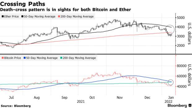 截至发稿,比特币涨2.20%,报42652.19美元/枚。2022年至今,比特币仅有三个交易日是上涨的。尽管第二大加密货币以太坊在周二上涨至3233美元/枚左右,但其似乎也将形成死亡交叉。