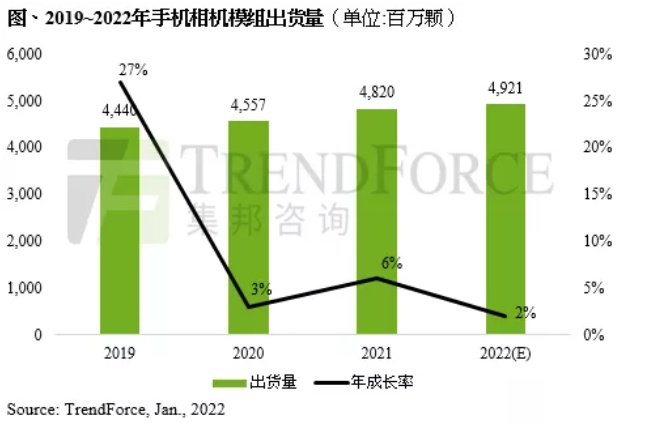 智通财经APP获悉,TrendForce集邦咨询发文称,近年智能手机相机模组的后置镜头数量持续增加,根据研究显示,三镜头在2020年超越双镜头成为主流,带动智能手机相机模组出货量持续成长,预估2022年智能手机相机模组出货量有望达49.2亿颗,年增2%。整体而言,TrendForce集邦咨询认为,智能手机相机所搭载镜头数量的多寡,将不再是品牌商主要追逐的重点,而是回归消费者真正的需求。因此,预期三镜头仍将是未来2~3年的主流设计。