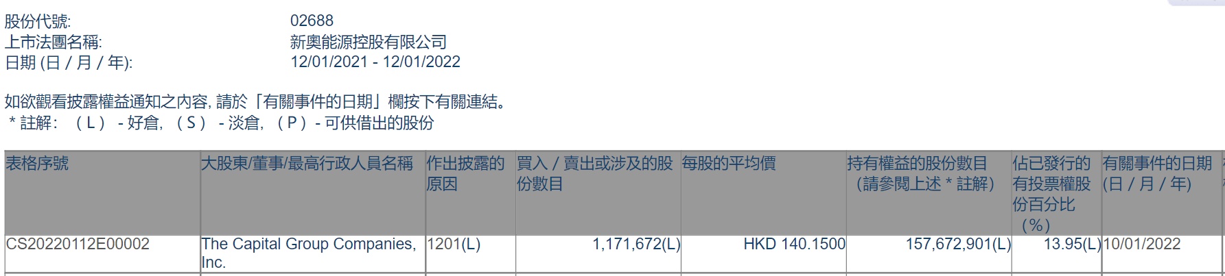 智通财经APP获悉,香港联交所最新资料显示,1月10日,美国资本集团减持新奥能源(02688)约117.17万股,每股作价140.15港元,总金额约为1.64亿港元。减持后最新持股数目约为1.58亿股,最新持股比例为13.95%。