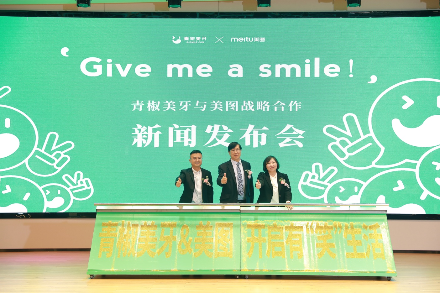 从左到右分别为:美图公司高级副总裁-何松林、现代牙科执行董事兼行政总裁-魏圣坚、青椒美牙负责人-沈郁霞