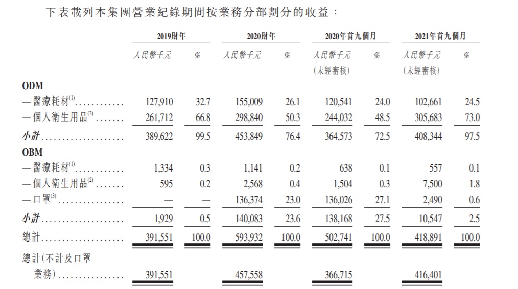 公司于2019年分别以品牌“捷护佳”及“月自在”正式进军医疗耗材及个人卫生用品市场。于2019财年、2020财年及2021年首九个月,OBM业务(不计及口罩业务)所得收益分别占收益总额约0.5%、0.6%及1.9%。