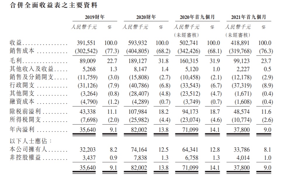 于2019财年,2020财年及2021财年首九个月,公司的收益分别为人民币3.92亿元、5.94亿元及4.19亿元。同期,年内溢利分别为人民币3564万元、8200.2万元及3780万元。