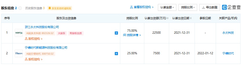 智通财经APP获悉,企查查App显示,1月12日,邵武永太高新材料有限公司发生工商变更,股东新增宁德时代新能源科技股份有限公司,持股25%。据公开资料显示,永太高新专业进行锂电池电解液核心材料的生产,主要产品为六氟磷酸锂、双氟磺酰亚胺锂、氟化锂。