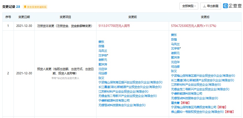 智通财经APP获悉,企查查App显示,1月11日,无锡东恒新能源科技有限公司发生工商变更,新增宁德时代新能源科技股份有限公司全资子公司宁波梅山保税港区问鼎投资有限公司为股东。据公开资料显示,东恒新能源成立于2011年8月,从事于高性能锂离子电池碳负极材料及碳纳米管导电剂、导电浆料的生产,产品应用于能源、汽车制造、电子产品等领域。