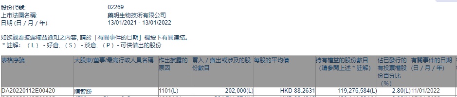 智通财经APP获悉,香港联交所最新资料显示,1月11日,执行董事兼CEO陈智胜增持药明生物(02269)20.2万股,每股作价88.2631港元,总金额约为1782.91万港元。增持后最新持股数目约为1.19亿股,最新持股比例为2.80%。