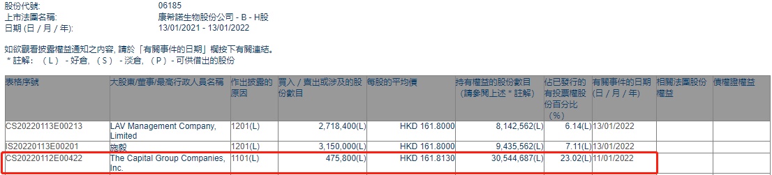 智通财经APP获悉,香港联交所最新资料显示,1月11日,美国资本集团增持康希诺生物-B(06185)47.58万股,每股作价161.8130港元,总金额约为7699.06万港元。增持后最新持股数目约为3054.47万股,最新持股比例为23.02%。