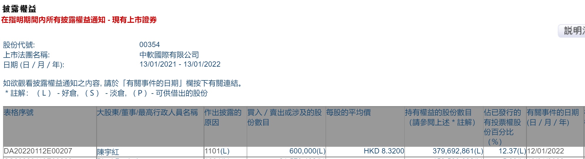 智通财经APP获悉,香港联交所最新资料显示,1月12日,董事会主席陈宇红增持中国软件国际(00354)60万股,每股作价8.32港元,总金额为499.2万港元。增持后最新持股数目约为3.8亿股,最新持股比例为12.37%。