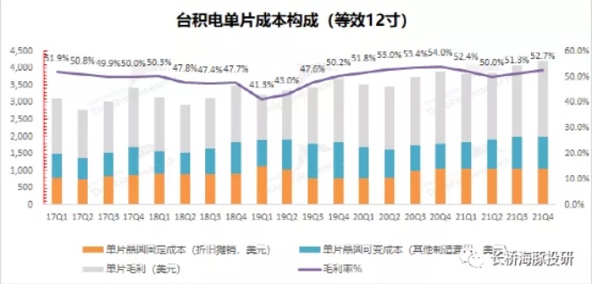 2、价格端继续推动毛利率上行,原材料涨价压力按下暂定键。四季度台积电毛利率52.7%,略超彭博市场一致预期(52%)。本季度毛利率的提升,除了出货均价因素之外,还有一个好的迹象:本季度摊销之外的其他制造成本意外收缩,考虑到这里面主要是人工+原材料,而人工一般很少下降,可以合理推断硅片等原材料价格刹车也明显释放了毛利,而且这个是有持续性的,后续毛利还能持续改善;