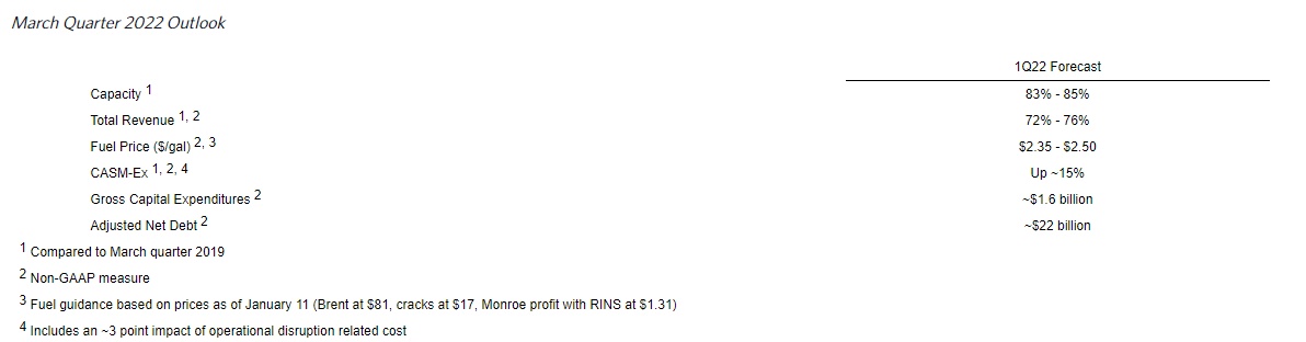 达美航空预计2022年第一季度总营收达到2019年同期的72%-76%,运力恢复达83%-85%。预计资本支出总额约为16亿美元,调整后净债务约为220亿美元。
