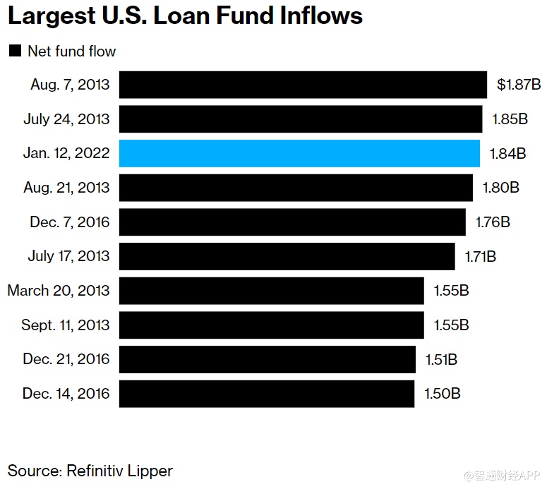 周四,根据理柏(Lipper)的数据,截至1月12日的一周,这些基金吸纳了约18.4亿美元。数据显示,这是有史以来第三大流入量,也是2013年8月以来的最高值,当时美联储希望结束为应对全球金融危机而开始的债券购买计划。