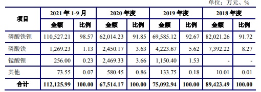 公司生产的磷酸铁锂正极材料主要用于锂电池的制造,下游主要用于新能源电动汽车,是公司主要收入来源,2018年、2019年、2020年及2021年1-9月,公司磷酸铁锂项目分别实现收入8.20亿元、6.96亿元、6.20亿元及11.05亿元,占总收入的比例分别为91.72%、92.67%、91.85%及98.57%。