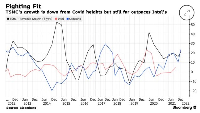 台积电的营收增长相较新冠疫情时期有所下降,但仍远超英特尔
