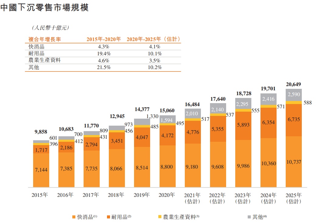 其中的下沉市场增长速度超过整个市场的增速,下沉市场规模从2015年的9.9万亿元增长至2020年的15.1万亿元,复合年增长率达到8.8%;预计2020至2025年的复合年增长率为6.5%,下沉市场规模将在2025年达到20.6万亿元。
