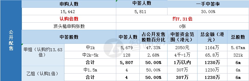 其中,公开配售申购人数15442人,一手中签率30%,认购倍数约7.31倍。