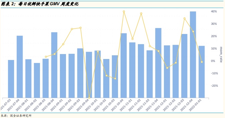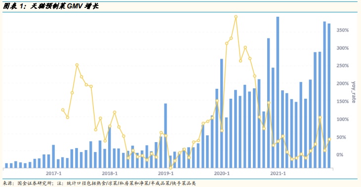 预制菜满足家庭美味便捷诉求,叠加春节假期将至和多地疫情反复情况,需求走旺:2020年开始,预制菜在线上渠道快速起量,2021年12月,该行推算天猫预制菜GMV同增约45%、增速环比提升约30pct,是继2月春节、10月电商大促之后年内月度增速高点;2022年元旦前一周(21W52)生鲜到家平台每日优鲜快手菜类目GMV较上月同期增长约25%,品类周度GMV达到下半年最高峰,反映预制菜已成为节假日在家用餐的新选择。据商务部数据,2021年网上年货节中,重点监测在线餐饮平台年夜饭系列商品销售额较上一年春节同期增长96%,其中半成品、特色年菜、年夜饭分别增长380%、110%和70%以上。2022年在多地疫情反复、就地过年增加情况下,预计预制菜需求在今年电商年货节和春节期间也有望得到进一步释放。