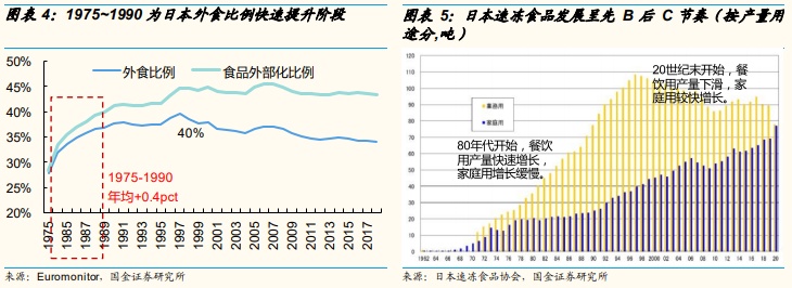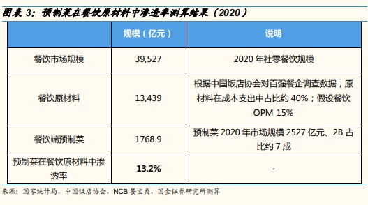 预制菜帮助餐企降本增效,2020年规模超2500亿、ToB占比超7成,在餐饮原材料中渗透率约13%,看好与餐饮行业发展形成正向互动:餐饮成本结构中,房租及物业、人力开支上升最快,根据中国饭店协会对百强餐企调查数据,2019年两项开支平均占收入比分别为21%、12%,较2018年分别上升3pct、4pct,企业降本诉求强烈。预制菜能有效帮助餐企减少门店工序、稳定出餐口味、降低食品安全风险、节省人力成本及厨房空间。参考1980~2000日本餐饮行业与速冻食品ToB业务相伴成长的历史经验,预计中国外食率上升与预制菜发展亦将相互加强。根据NCB餐宝典数据,2020年国内预制菜市场规模2527亿元、5年复合增速31.2%,预计未来五年仍有望维持双位数增速,其中餐饮端需求占比7成以上,根据该行的测算结果,2020年在餐饮原材料中渗透率13.2%,未来有望进一步上升。