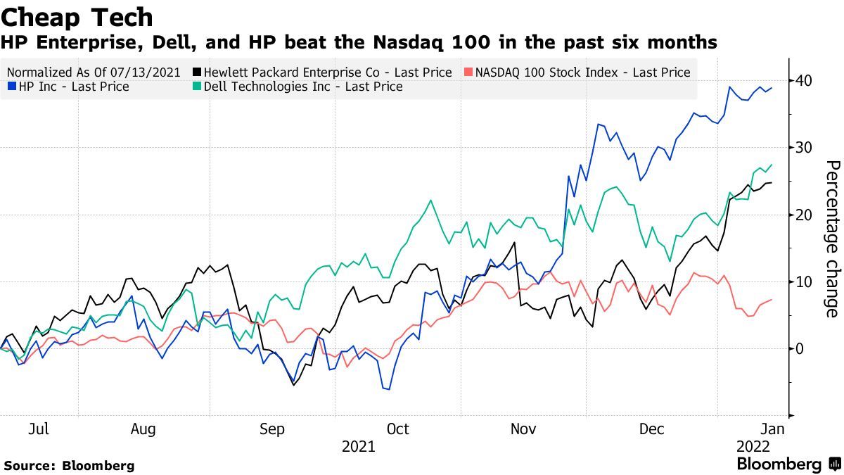 据统计,今年以来,以科技股为主的纳斯达克100指数跌幅达5.05%,与此同时,惠普和戴尔两家PC巨头分别上涨2.73%和7.12%,最新数据显示两家公司未来12个月预期市盈率均不到9倍水平,这两只股票在半年期都轻松跑赢纳斯达克100指数。