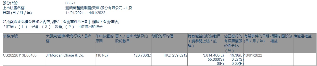 智通财经APP获悉,香港联交所最新资料显示,1月10日,小摩增持凯莱英(06821)12.67万股,每股作价259.8212港元,总金额约为3291.93万港元。增持后最新持股数目为381.44万股,最新持股比例为19.38%。