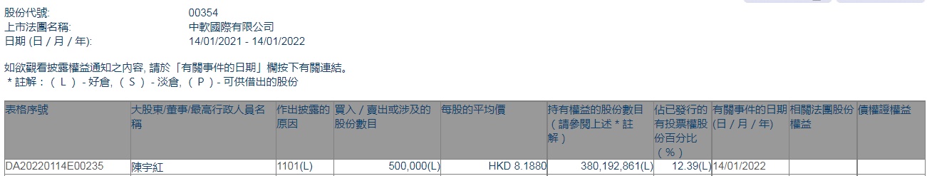智通财经APP获悉,香港联交所最新资料显示,1月14日,董事会主席陈宇红增持中软国际(00354)50万股,每股作价8.188港元,总金额为409.4万港元。增持后最新持股数目约为3.8亿股,最新持股比例为12.39%。