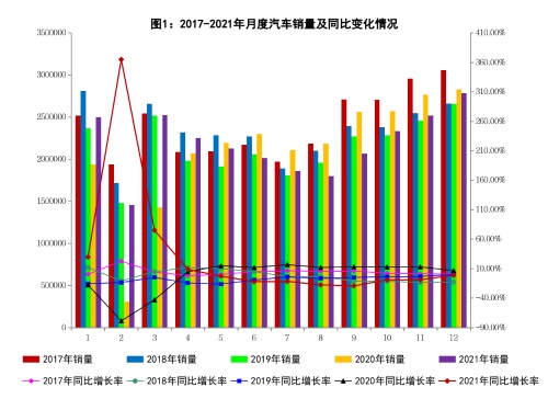 2021年,我国汽车产销分别完成2608.2万辆和2627.5万辆,同比分别增长3.4%和3.8%,结束了连续3年的下降趋势。新能源汽车销售完成352.1万辆,同比增长1.6倍,连续7年位居全球第一。