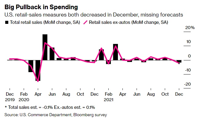 智通财经APP获悉,美国12月零售销售额出现10个月来最大跌幅,数据显示,12月零售销售额环比下降1.9%。这在一定程度表明数十年来最剧烈的物价涨幅正在对美国消费者支出造成更大程度的负面影响,与此同时,美国正面临奥密克戎变异病毒肆虐。