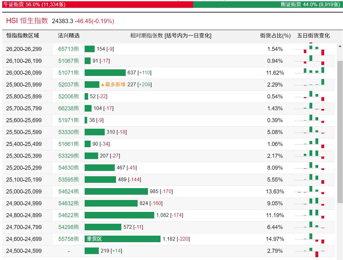 法兴恒指牛熊证街货分布图中的数据显示,熊证街货重货区在24600-24699区间,该区间最新熊证数量为1182张,较上一交易日减少220张;最多新增在25900-25999区间,该区间最新熊证数量为227张,较上一交易日增加209张。