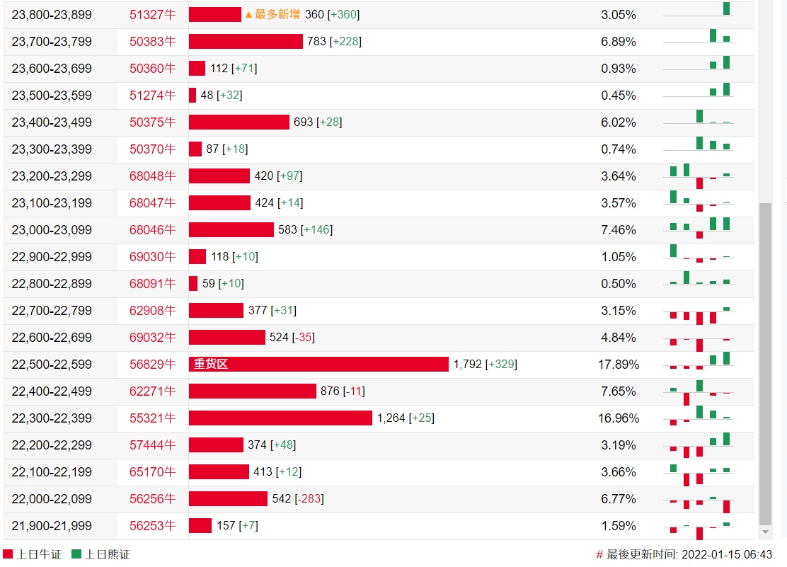 牛证街货重货区在22500-22599区间,该区间最新牛证数量为1792张,较上一交易日增加329张;最多新增在23800-23899区间,该区间最新牛证数量为360张,较上一交易日增加360张。