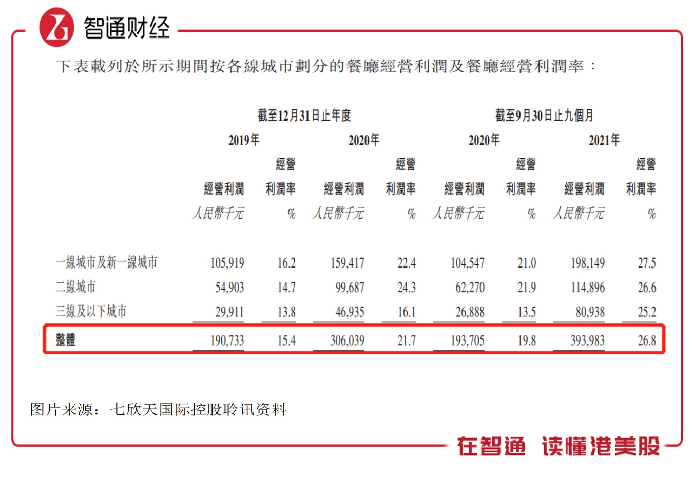 据聆讯资料,七欣天国际控股新开设一家七欣天餐厅的平均成本160万元,已投入运营的大部分餐厅1-4个月内达致盈亏平衡,投入运营的餐厅的平均现金投资回报期约为18个月。该公司餐厅的经营效率提升明显,2020年在客单价未显著提升情况下,整体利润率提升了6.3个百分点,2021年首九月,在客单价涨价下,其餐厅经营利润率为26.8%,同比再次提升7个百分点,其中三线及以下城市贡献最为明显。