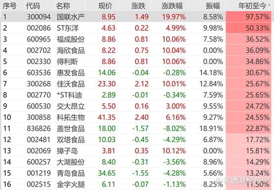 国联水产(300094.SZ):公司是中国首家对虾、罗非鱼双BAP四星认证企业,是中国最大的水产上市企业,也是中国规模最大的对虾加工销售企业。主要产品可以分为:以预制菜品为主的精深加工类、初加工类、全球海产精选类。其中精深加工及预制菜品以“龙霸”与“小霸龙”为品牌,产品主要包括水煮、裹粉、米面、调理、火锅烧烤等系列。目前已经进入盒马等新零售渠道销售,具备爆品潜力。