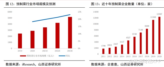 随着近年来冷链技术快速发展,预制菜行业配送障碍逐渐消除。2011-2020年,预制菜相关企业注册数量呈上升趋势,自2015年起行业进入快速发展期,行业企业首次突破4000家,2018年首次突破8000家。2006-2020年我国零售端预制菜行业(包括加工肉类与海鲜制品、加工蔬菜及水果制品、预制餐)CAGR为7.3%,2020年受疫情影响家庭预制菜消费量出现井喷,新注册1.25万家企业,同比增长9%,行业增长9.64%,规模达到2422亿元。天眼查显示,目前我国已有7.2万家预制菜企业。