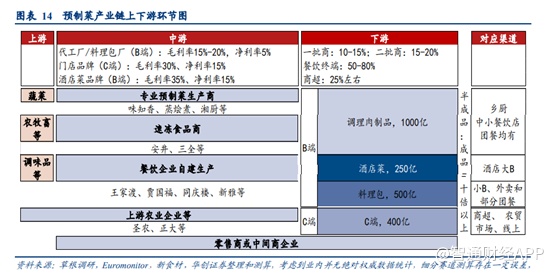 中游生产环节玩家多样,盈利能力有所分化。生产环节有专业预制菜厂商(含速冻食品商)、餐饮企业自建央厨、上游农业企业、部分零售型企业等。一般情况下自建工厂、代工厂、料理包厂等毛利率在15%-25%区间,上规模性企业净利率可达5%。酒店菜因为具备较高门槛和品质要求,毛利率可达35%左右。而2C型企业毛利率常在30%以上。酒店菜和2C产品具备一定门槛和品牌溢价,净利率10%-15%较为常见。
