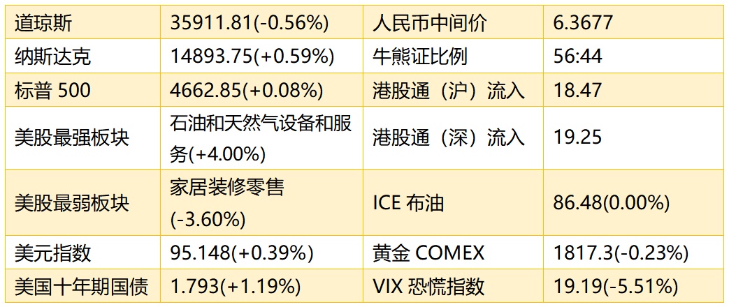 1.上周五美股道指跌201.81点,跌幅0.56%,报35911.81点;纳指涨86.94点,涨幅0.59%,报14893.75点;标普500指数涨3.82点,涨幅0.08%,报4662.85点。上周道指下跌0.88%,标普500指数下跌0.3%,纳指下跌0.28%。港股ADR指数小幅上涨,按比例计算,收报24439点,涨55.89点或0.23%。