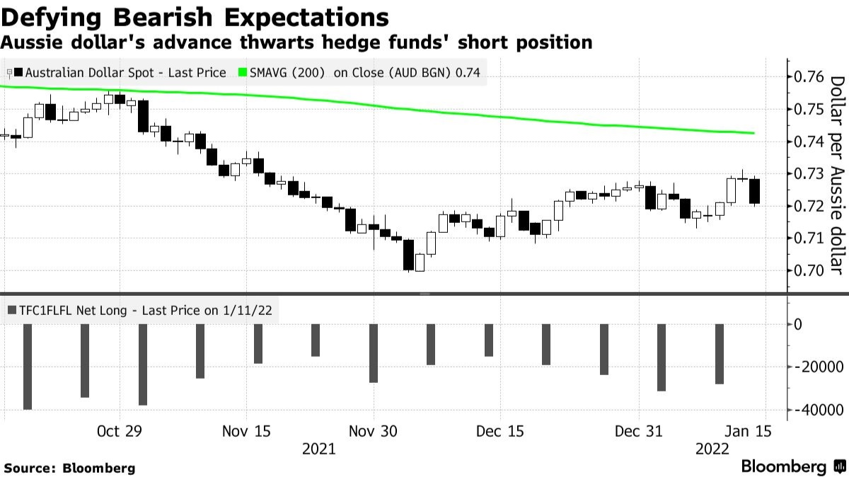尽管澳大利亚央行不愿发出近期加息的信号,交易员仍认为该行将在2022年加息约87个基点。但自美联储12月发表鹰派政策声明以来,对冲基金已越来越看跌澳元。