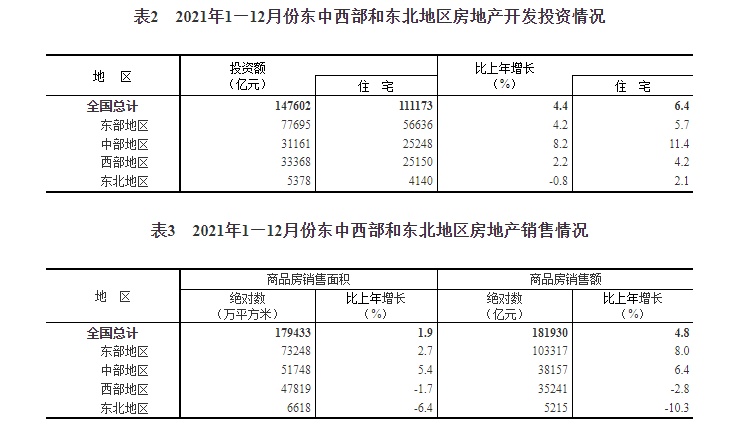 2021年,东部地区房地产开发投资77695亿元,比上年增长4.2%;中部地区投资31161亿元,增长8.2%;西部地区投资33368亿元,增长2.2%;东北地区投资5378亿元,下降0.8%。