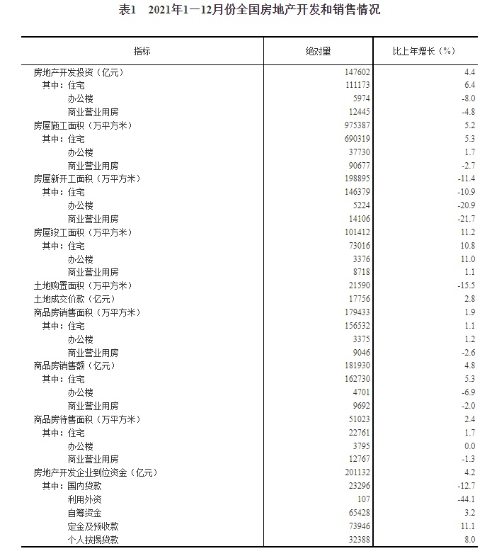 2021年末,商品房待售面积51023万平方米,比11月末增加858万平方米。其中,住宅待售面积增加480万平方米,办公楼待售面积增加94万平方米,商业营业用房待售面积增加46万平方米。